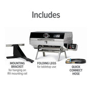 - Connections: Connects to low pressure propane supply on RV; Easy to Transport: Grill features latch and handle for convenient portability